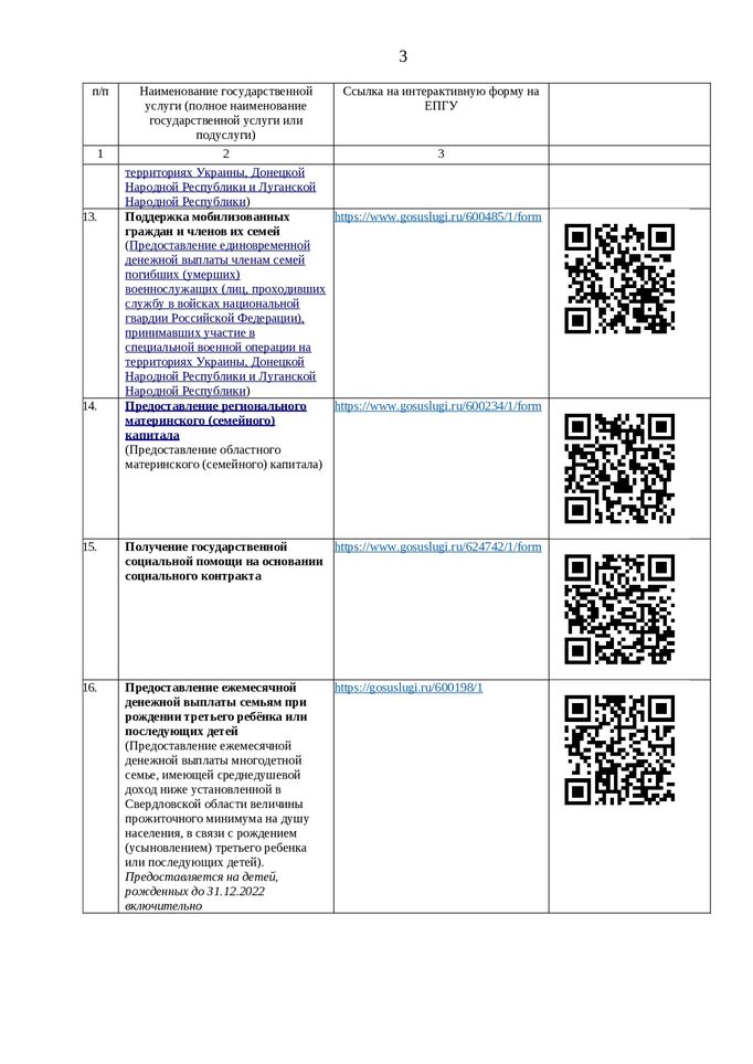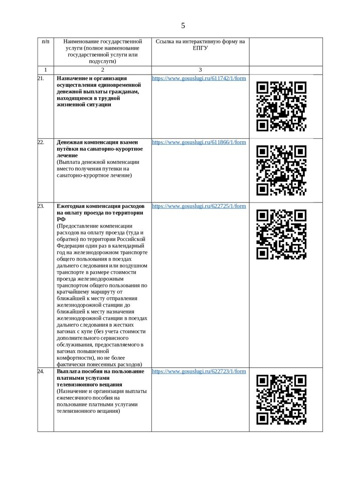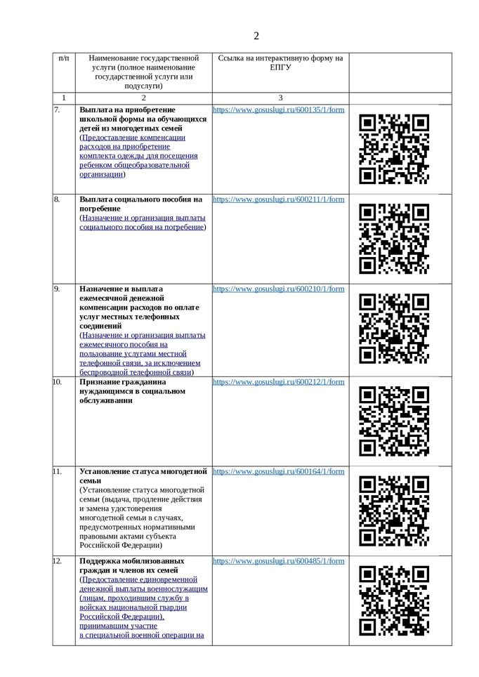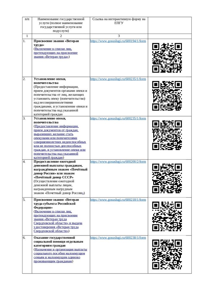 Перечень государственных услуг, предоставляемых в электронном виде, и QR-коды, по которым с помощью мобильного телефона можно перейти на ЕПГУ для подачи заявления на предоставление государственных услуг в электронном виде: