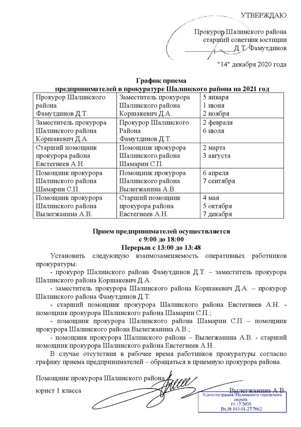 График приема предпринимателей в прокуратуре Шалинского района на 2021 год