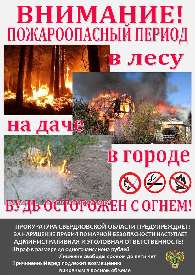 ПРОКУРАТУРА СВЕРДЛОВСКОЙ ОБЛАСТИ ПРЕДУПРЕЖДАЕТ: ЗА НАРУШЕНИЕ ПРАВИЛ ПОЖАРНОЙ БЕЗОПАСНОСТИ НАСТУПАЕТ АДМИНИСТРАТИВНАЯ И УГОЛОВНАЯ ОТВЕТСТВЕННОСТЬ!