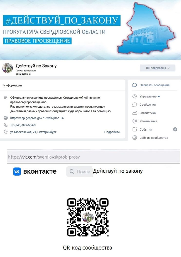 С 2 мая 2022 г. в социальной сети «ВКонтакте» зарегистрирован официальный аккаунт (страница) прокуратуры Свердловской области по правовому просвещению «Действуй по Закону»