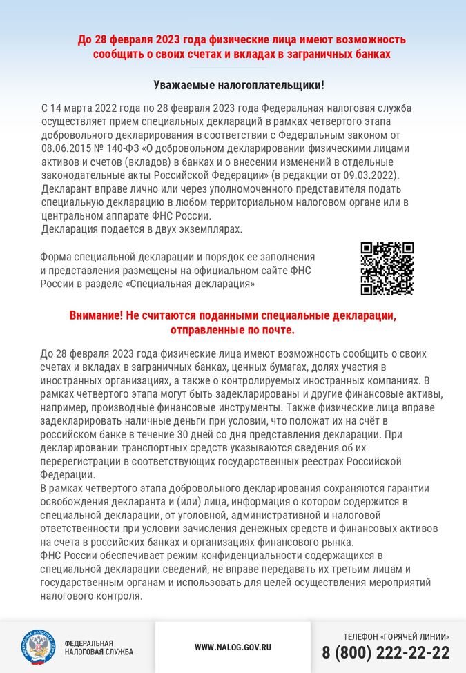 До 28 февраля 2023 года физические лица имеют возможность сообщить о своих счетах и вкладах в заграничных банках