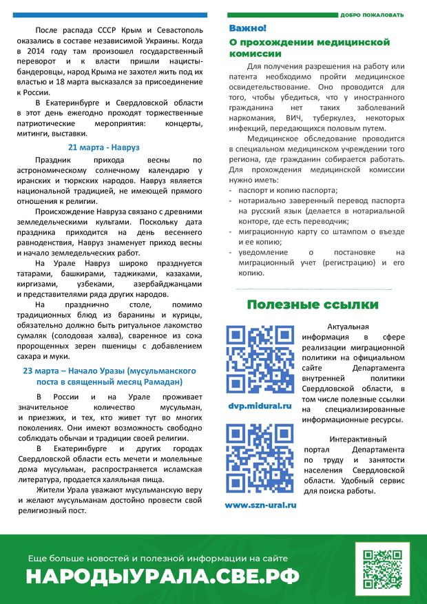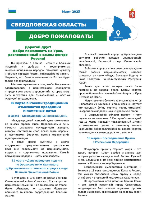 Информационный бюллетень для иностранных граждан, содержащий сведения об изменениях миграционного законодательства и иных нормативных правовых документах в данной сфере, предстоящих государственных праздниках, памятных датах, спортивных и общественно-культурных мероприятиях, рекомендуемых для посещения иностранными гражданами, об общепринятых в российском обществе нормах поведения и морали. Выпускается ежемесячно.
