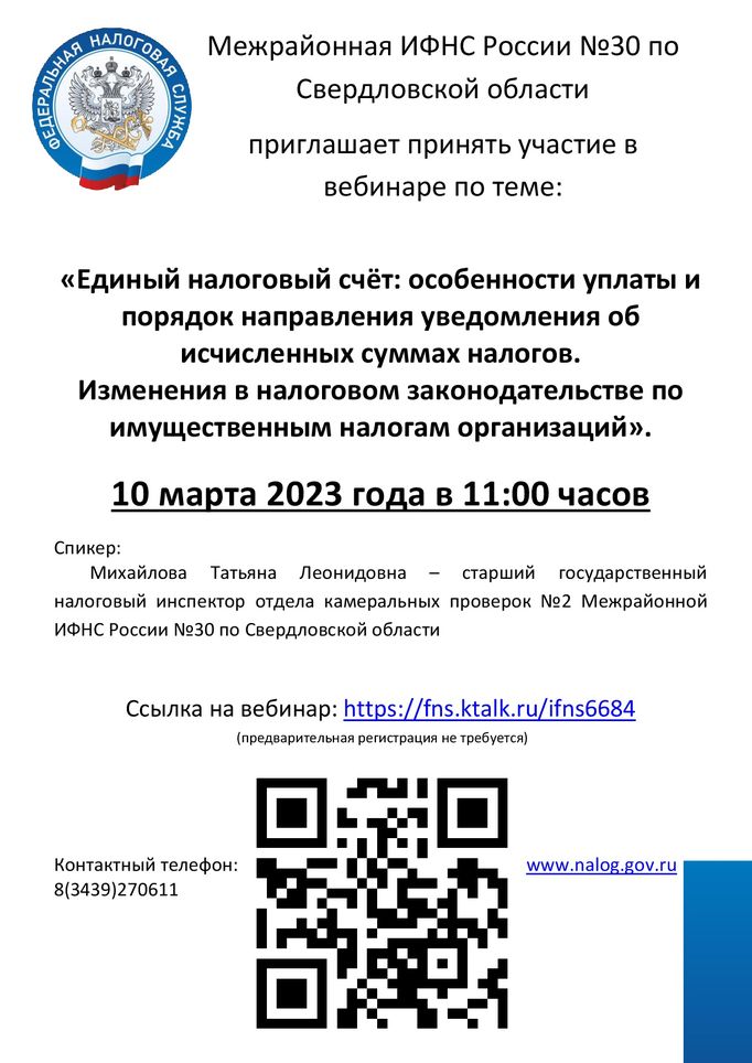 7 марта 2023 Вебинар по теме: Единый налоговый счёт: особенности уплаты и порядок направления уведомления об исчисленных суммах налогов. Изменения в налоговом законодательстве по имущественным налогам организаций.