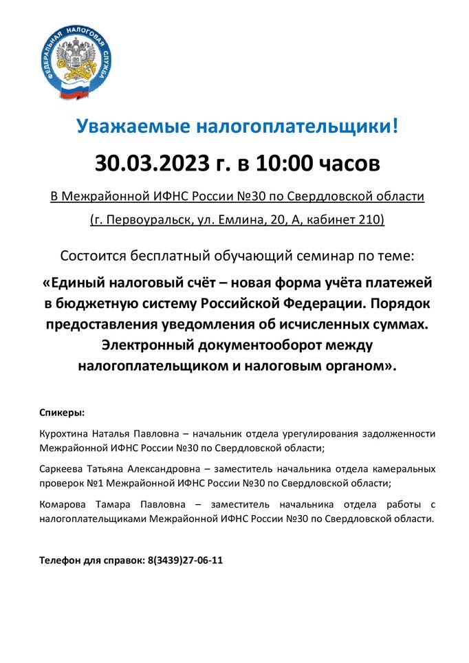 20 марта 2023 Cеминар по теме: «Единый налоговый счёт – новая форма учёта платежей в бюджетную систему Российской Федерации. Порядок предоставления уведомления об исчисленных суммах.