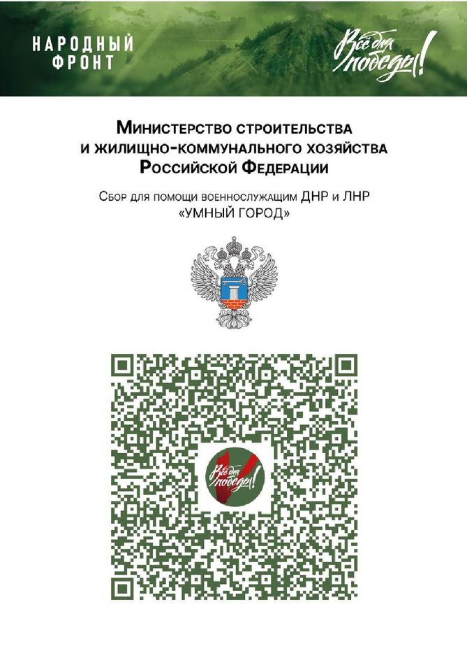Совместно с Народным Фронтом в рамках проекта "Все для Победы!" Министерство строительства и жилищно-коммунального хозяйства Российской Федерации поддерживает проведение акции Сбор "Умный город".
