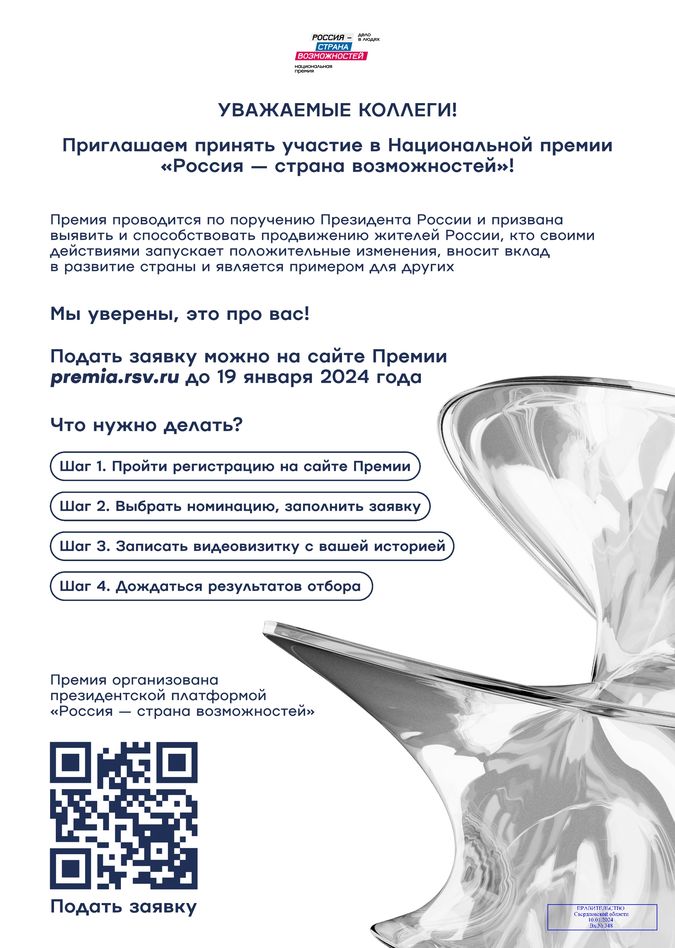 Национальная премия «Россия – страна возможностей» проводится по поручению Президента РФ. Этот конкурс для каждого, кто готов реализовать свой потенциал, внести свой вклад в развитие общества и быть примером для других.