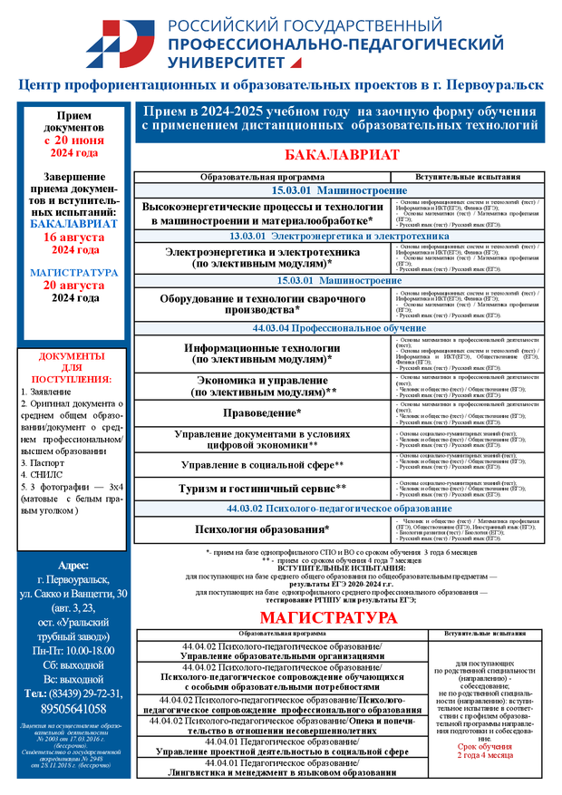 По вопросам поступления можно обратиться по телефонам: 8-950-564-10-58 – руководитель Центра ПиОП в г. Первоуральск РГППУ Сёмина Светлана Валентиновна или 8-952-138-87-24 (специалист Ирина Валерьевна), 8(3439) 29-72-31.