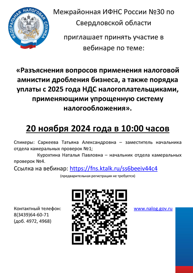 18 ноября 2024 Разъяснения вопросов применения налоговой амнистии дробления бизнеса, а также порядка уплаты с 2025 года НДС налогоплательщиками, применяющими упрощенную систему налогообложения