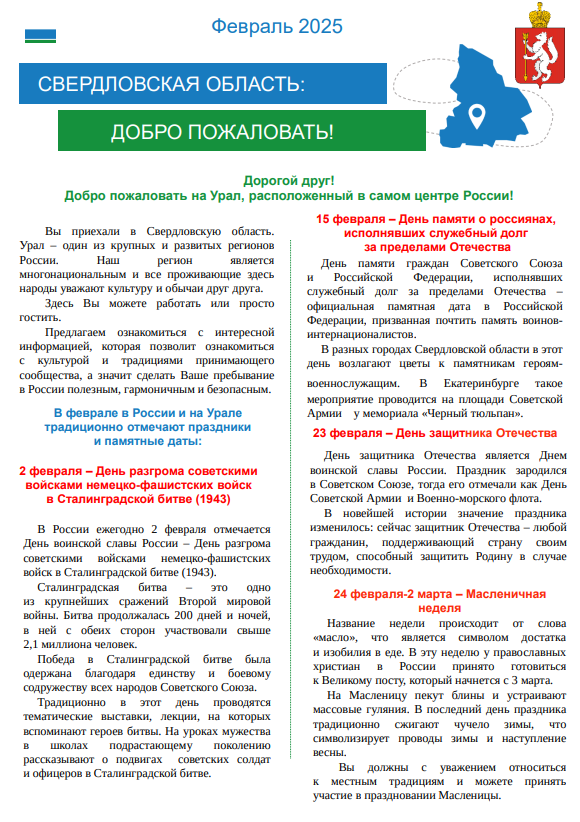 28 января 2025 Бюллетень для иностранных граждан на февраль 2025 года, в котором содержатся сведения о государственных праздниках, памятных датах и полезная информация.