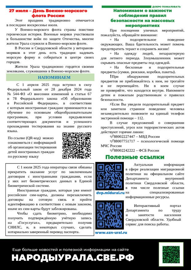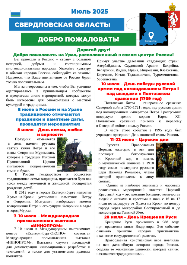 Бюллетень для иностранных граждан на июль 2025 года, в котором содержатся сведения о государственных праздниках, памятных датах и полезная информация.