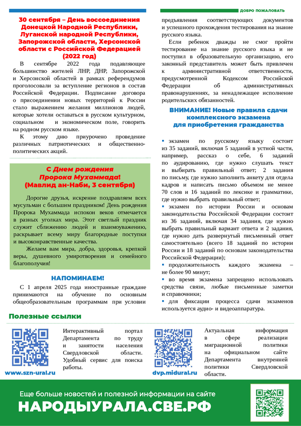 22 августа 2025 Бюллетень для иностранных граждан на сентябрь 2025 года, в котором содержатся сведения о государственных праздниках, памятных датах и полезная информация.