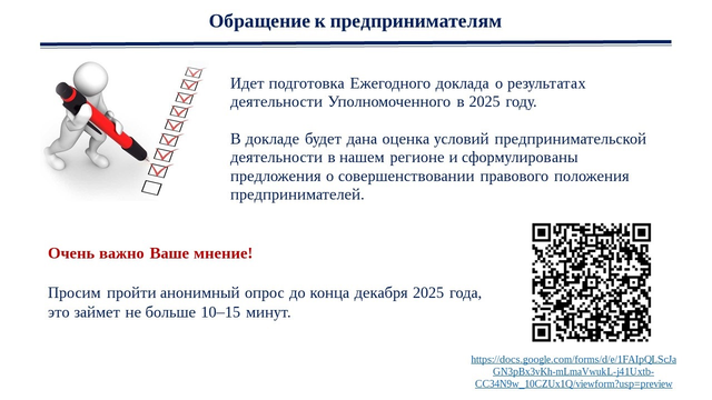 Идет подготовка Ежегодного доклада о результатах деятельности Уполномоченного по защите прав предпринимателей в Свердловской области в 2025 году. В Докладе будет дана оценка условий осуществления предпринимательской деятельности в нашем регионе и сформулированы предложения о совершенствовании правового положения предпринимателей.